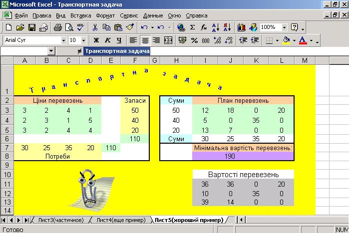 Транспортну задачу можна легко розв'язувати в Microsoft XL, що можна подивитись тут, а тут можна ознайомитись з усіма тонкощами виконання цієї задачі.